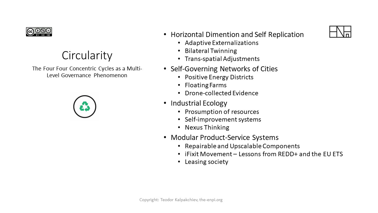 | The paper addresses the fact that diffusion and materialization of the umbrella concept of circularity as an applied version of the metrics-informed authority for progressing sustainability necessitates a discursive construction, that takes into consideration multiple levels of implementation. | Four Concentric Cycles of the Circular Economy | https://bit.ly/3rtzpxd |